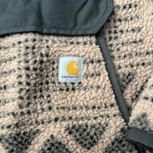 Warm Carhartt fleece with geometric design. Features a front pocket and button-up collar.