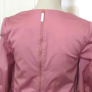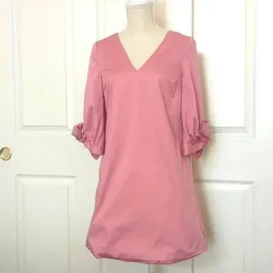Dusty pink color. Structured shift dress. Oversize bow sleeves, half sleeve. V neck. Short dress. Lined, cotton. Gold tone zipper closure in back. Has hidden pockets. 97% Cotton, 3% Elastane
