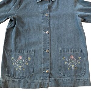 Adorable vintage denim jacket shacket. Intricate embroidered floral details on the pockets. Cute pearl buttons. Best for a women's large, could fit an XL or smaller for an oversized look.