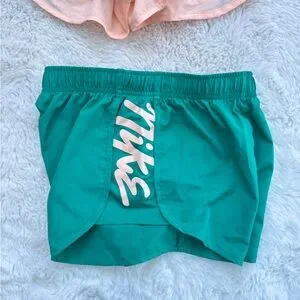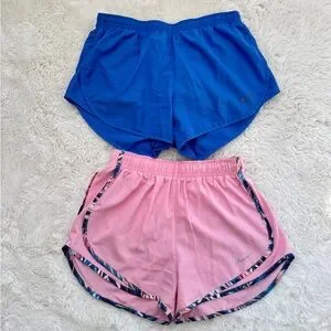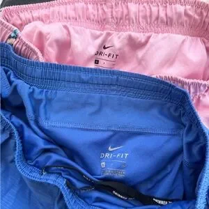 Bundle of 5 pairs of Nike athletic shorts size S. One pair is light pink with blue patterned trim. One pair is blue featuring a zip pocket in the back for keys etc. This pair has some discoloration of the Nike logo. One pair is peach pink. One pair is green with “Nike” written in cursive down the side in peach pink and matching logo. One pair is heathered gray / black.
