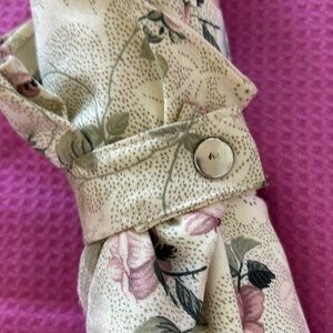 Elegant floral umbrella with a wooden handle. Features a beautiful floral pattern.