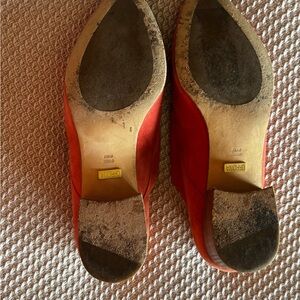 Italian handcrafted salmon-colored, smooth suede loafer style shoes; with decorative kiltie fringe and 1.5 inch stacked wood heel. Exceptional craftsmanship. Elegant and playful. European size 39, US size 8.5 - 9.