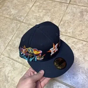 The product is a New Era Houston Astros 2017 World Series Champions Groovy Patch Blue UV 7 3/8 cap or hat. This officially licensed item commemorates the Houston Astros' victory in the World Series, making it a must-have for any baseball fan. The blue color and unique groovy patch design show off team pride and style while the 7 3/8 size ensures a comfortable fit for fans of the Major League (MLB) sport. Perfect for showcasing support for the Houston Astros and celebrating their championship win.