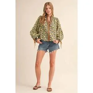 CONTRAST NECKLINE SMOCKED PUFF SLEEVE TOP