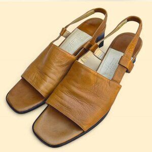 Cole Haan City slingback sandals in tan leather. Made in Italy. Women's size 9.5 AA. Soft genuine leather upper with natural creasing. Square toe/ Mid wood block heel. Classic 90s/early-2000s minimal vibe. Decent condition, as reflected in price. Retail was about $250