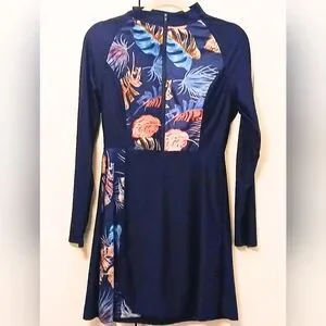 It includes a navy blue tunic style rashguard top that is long enough to cover your backside. It comes with matching navy blue waterproof pants.