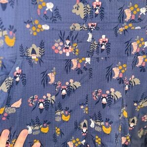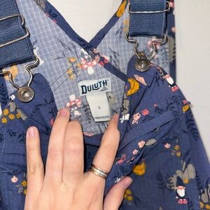 These Duluth Trading Co short overalls are an absolute rare gem and no longer sold or produced. Featuring a deep blue base with a whimsical, cottage-core inspired woodland-style print, these overalls are both playful and incredibly well-made—classic Duluth quality through and through.