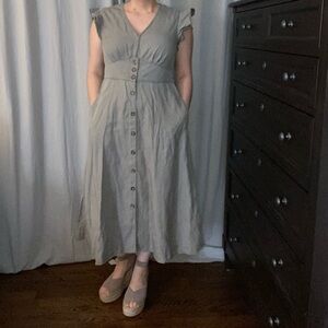 Stylish midi dress with button-down front. Top has concealed hook clasps at bust. Features short flutter sleeves, pockets and a flattering fit. Effortless and relaxed look for summer and spring! Casual. Granola. Sustainable. Crunchy. Lightweight. Flirty. Romantic. Feminine. Modest.