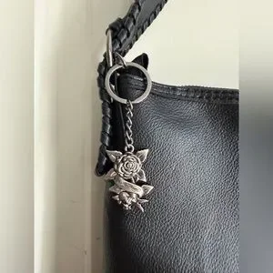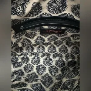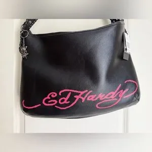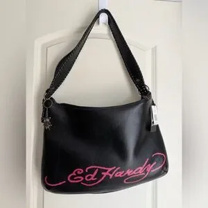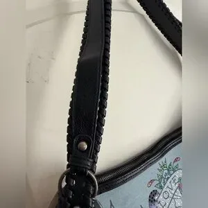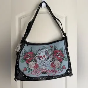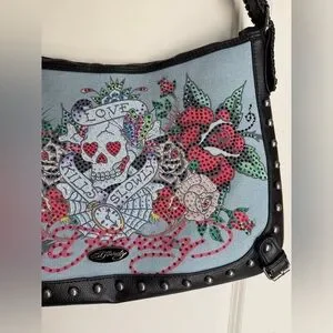 Ed Hardy shoulder bag with bold floral and skull design. Features black and blue color scheme. Ideal for a standout look.