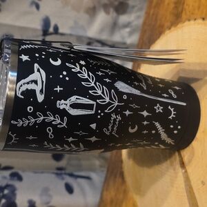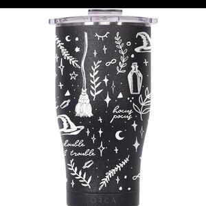Orca tumbler with Halloween-themed design. Features broomsticks, stars, and moons in black and white.