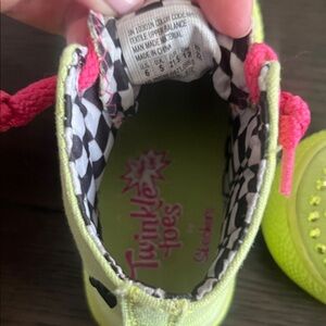 Brighten up your toddlers wardrobe with these vibrant neon green and pink high-top sneakers. Perfect for playtime and everyday adventures.
