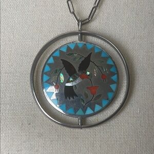 Zuni spinner pendant, vintage inlay, sterling silver