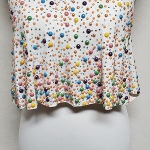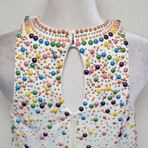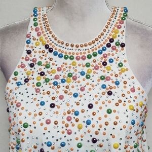 Draped top with a jewel neckline covered in bright pastel beads and crystals.