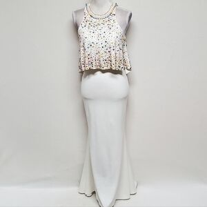 Tony Bowls Ivory Multi-color Beaded Jewel Neckline Draped Two-Piece Dress.