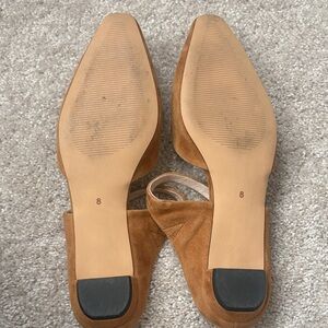 Stylish tan suede mules by INTENTIONALLY BLANK. Features a pointed toe and open back. Perfect for versatile wear.