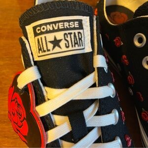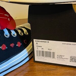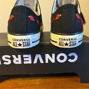 Chuck Taylor All Star sneakers in black with white laces, white foxing, and cute hearts and cherries embroidery throughout. Converse All Star logos on heel and tongue. Cute sneakers! NWT mint condition, comes in Converse box without lid.