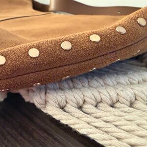 Our best-selling leather bag collection is cool, modern and quietly luxe. With a secure top zipper and interior pocket, this slouchy, stud-embellished suede bag is perfectly sized to hold up to an iPad, water bottle, phone, wallet and keys—plus, it has an adjustable strap that can be worn crossbody or over the shoulder. It's so good, it's Essential.