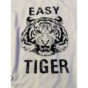 Bold graphic sweatshirt featuring a fierce tiger face and "Easy Tiger" text on the front. Soft, stretchy fabric with a comfortable relaxed fit. Long sleeves and classic crew neckline make it easy to style casually or layered.