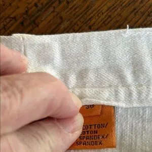 Elegant white denim pants with a straight-leg design. Features a subtle gold logo detail on the back pocket.
