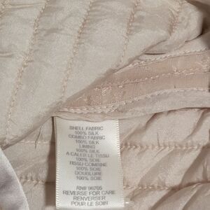 Elevate your look with this Rebecca Taylor silk quilted peplum jacket, blending timeless femininity with modern polish. Crafted from soft, lightweight silk with subtle sheen, this blush-nude jacket features vertical quilted stitching, tailored seams, and a cinched waist with gentle peplum flare that flatters every figure.