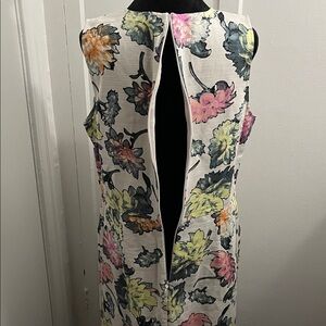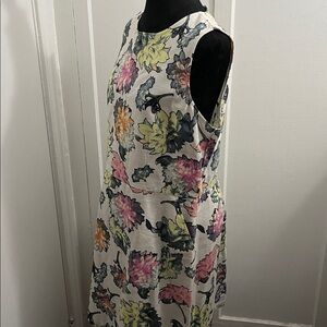 Euc, is a sleeveless shift or A-line dress featuring a vibrant, multi-colored floral print with shades of pink, orange, yellow, and green on a white or off-white background.