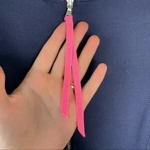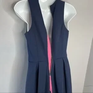 Navy blue dress with round neckline with keyhole on front, cutout shoulders, seamed waist, pleated a-line skirt, and exposed back zip with pink ribbon detail.