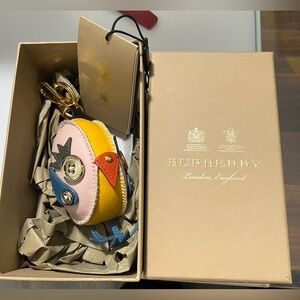 Charming Burberry bird keychain. Features pink, yellow, and blue accents. Gold clip for easy attachment.