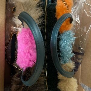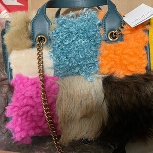 Bright and bold faux fur tote. Features a mix of vibrant colors. Eye-catching design for any occasion.