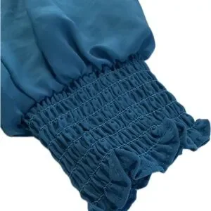 Chic teal blouse with V-neck. Features smocked waist and cuffs. Ideal for versatile styling.