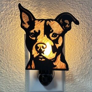 Handcrafted laser-cut wood night light depicts a soulful Pitbull or Staffy silhouette with a warm, layered grain finish. The intricate cutout design allows light to glow through the natural wood textures, creating a cozy atmosphere in any room. This plug-in wall light features a sturdy black base with an easy on-off toggle switch and includes a clear C7 LED Shatterproof bulb for immediate use. Perfect as a thoughtful gift for dog lovers.