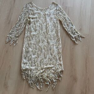 Shine in this elegant cream dress adorned with shimmering sequins. Perfect for special occasions, this dress offers a sophisticated and glamorous look.