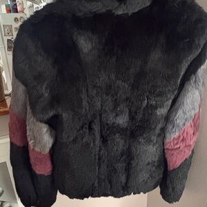 Stay warm and stylish with this chic vintage rabbit fur jacket. Featuring a luxurious blend of black, pink, and gray, it's perfect for any occasion.