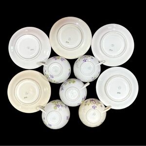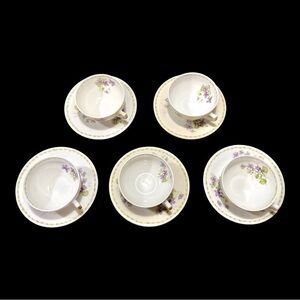 VINTAGE,LIMOGES FRANCE, 5 CUPS & 5 SAUCERS. WHITE BACKGROUND WITH PURPLE VIOLETS