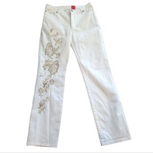 Very Vera Women's Gold Floral Embroidery White Straight Jeans Pants