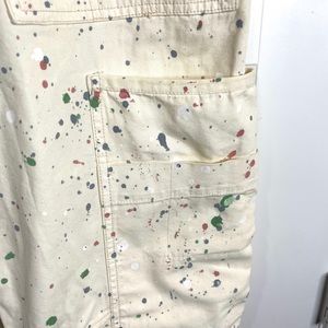 Features: Workwear pockets throughout, paint splatter detailing, adjustable belt, adjustable banded hemlines, zip fly and button closure