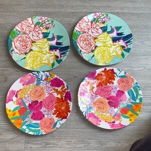 Set of four decorative plates with vibrant floral patterns. Features pink, yellow, and green hues.