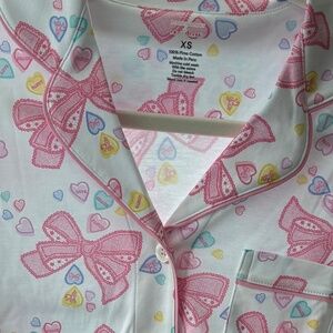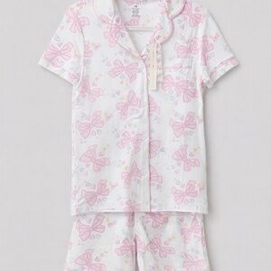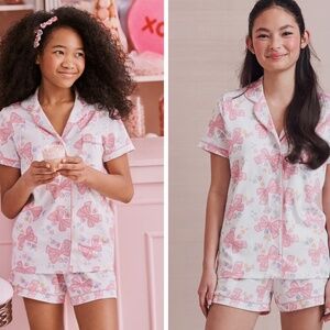 Limited edition LoveShackFancy collaboration! Super soft, breathable 100% Pima cotton short-sleeve, short set with the sweetest pastel bow print. Features button-front top, functional pocket, contrast piping, and elastic waist shorts.