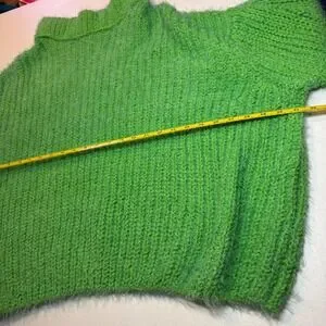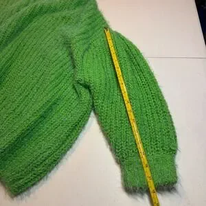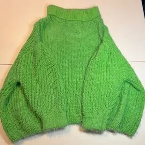 Free People Lime Green Mock Neck Fuzzy Knit Oversized Sweater. This vibrant lime green sweater features a cozy mock neck and a chunky, fuzzy knit texture for ultimate warmth and style. Designed with a relaxed, oversized fit and dropped shoulders, it offers a modern silhouette perfect for layering. The soft polyester and nylon blend ensures a comfortable feel against the skin.