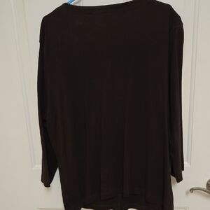 Chic brown button down shirt/cardigan by Rafaella. Features eye-catching gold embellishments. Ideal for versatile styling. Beautiful buttons all the way down the front.