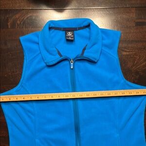 This sleeveless fleece vest from Lands' End features a sporty design in a solid blue/aqua color. Full zipper and 2 pockets on the front. It’s a versatile all-season weight. Perfect for cool evenings when you need a light layer for warmth. Also perfect under a coat when you need another layer in colder weather.