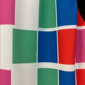 Vibrant dress with a geometric pattern. Features a mix of colors including red, pink, orange, yellow, green, blue, and black.