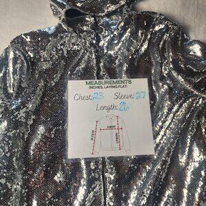 This Women's Shiny Sparkle Jacket is perfect for a festival or party, featuring a hooded design and long sleeves with sequin accents for added sparkle. Made from polyester, the jacket has a solid silver color and a zip closure for easy wear. The regular fit and polyester lining make it comfortable for casual occasions in the winter, fall, or spring seasons. Ideal for a stylish and eye-catching look, this jacket is a must-have for any fashion-forward woman wanting to make a statement.
