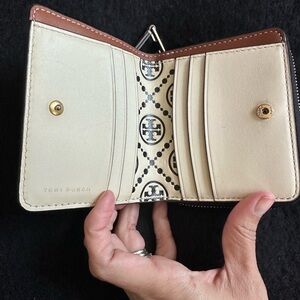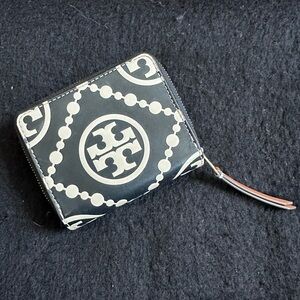 Chic wallet with Tory Burch logo pattern. Elegant design with zip closure.