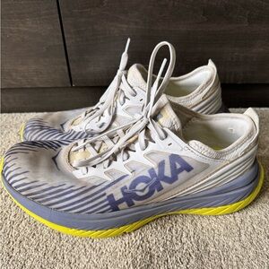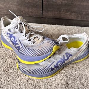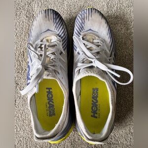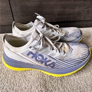 Hoka One Carbon X running shoes size 11 good pre owned condition. Lots of life left! Amazing foot and heal support. No box. Positioned as an endurance racer, the Carbon X-SPE delivers the same propulsive speed as its predecessor in a street-ready silhouette. Engineered with a responsive, carbon fiber plate and aggressive... View More BEST FOR: Road Running FEATURES: Light, stripped-back upper engineered in single-layer, polyester mesh Mesh bootie provides a secure fit Molded heel reinforcement for added support Tongue-free construction provides a comfortable, seamless fit Early stage Meta-Rocker delivers an up-tempo ride Reasonable offers are welcome! Fast delivery! Non-smoking and no pet household New to Poshmark? Use code Digging4dealz for $15 off your first purchase. Thanks for stoping by!