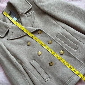J crew majesty stadium cloth by nello gori tan peacoat. 79% wool 21% nylon100% polyester lining. Last pic shows loose button and some staining on lining.