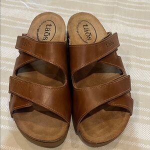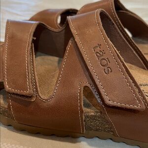 Taos Casita women's leather sandals feature two adjustable hook-and-loop straps for a custom fit and a supportive Euro cork midsole. The footbed is made of plush PU wrapped in suede for comfort. Good condition, smoke free.
