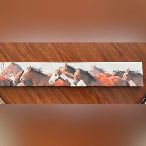 Beautiful wrapped canvas wall art featuring a group of horses. Perfect for equestrian lovers. Lightweight with wall hanging mount attached on back. 36” X 6” X 1”