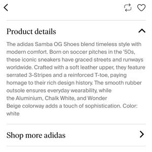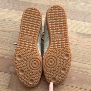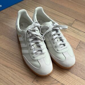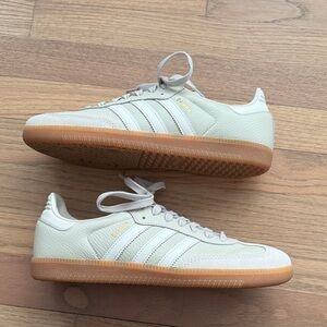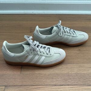 Adidas Samba OG sneaker in aluminum/chalk white/wonder beige colorway. Women’s size 10, worn once (too big), and in great condition. Note the outside stripes are white and the inside stripes are aluminum color.