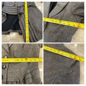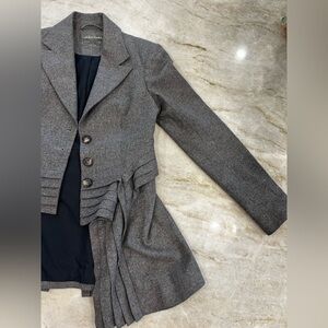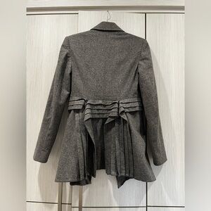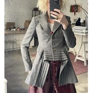Beautiful AllSaints Spitalfields pleated tuxedo-style jacket in a soft charcoal gray 100% wool with a dramatic high-low hem and structured pleating through the waist. Tailored fit with button front closure, notched lapels, and a long, cascading back that gives subtle Victorian-meets-tuxedo vibes. Fully lined in 100% cotton for comfort.