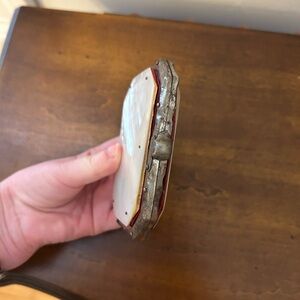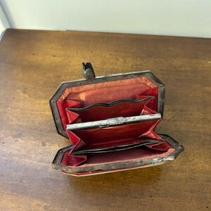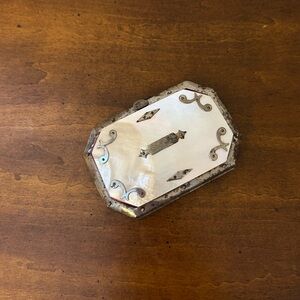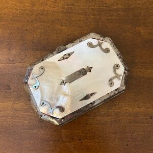 Vintage card holder with mother of pearl inlay. Features intricate silver detailing.